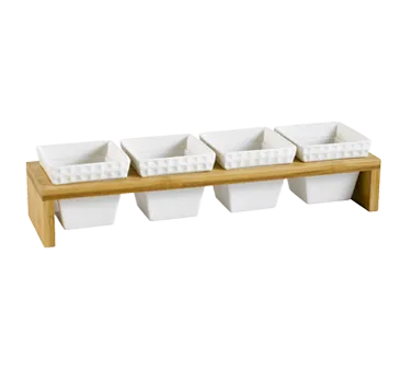Optimize workflow efficiency with the CAC China, PTW-5, Bowl Set. This five-piece set includes four square bowls and one rectangular bamboo stand, perfect for commercial restaurant use. The bowls have a capacity of 7 oz. and measure 3-1/2"L x 3-1/2"W x 3"H, while the stand measures 15-3/4"L x 4-1/4"W x 2-1/2"H. Made of durable porcelain in a sleek Bone White color, these bowls are dishwasher, oven, and microwave safe, ensuring easy cleaning and versatility in the kitchen. The bamboo stand adds a touch of elegance and provides a convenient way to display and serve the bowls. Whether you're serving appetizers, desserts, or small sides, this bowl set is a must-have for any commercial restaurant. Elevate your presentation and impress your customers with the CAC China, PTW-5, Bowl Set.