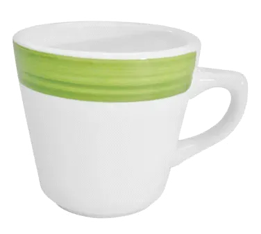 Stay at the culinary forefront with CAC China's R-1-G Cups. These vibrant Rainbow Coffee Cups are a must-have for any commercial restaurant. With a capacity of 7-1/2 oz., they are perfect for serving a variety of hot beverages. Made of durable stoneware, these cups are dishwasher, oven, and microwave safe, ensuring convenience and versatility in a busy kitchen. The 3-1/4" diameter and 3" height make them ideal for espresso shots, cappuccinos, or even small desserts. The stunning green color adds a touch of elegance to any table setting, while the round shape provides a comfortable grip. Elevate your restaurant's drink service with these eye-catching and practical cups from CAC China.