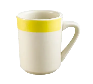 Craft culinary wonders with the CAC China R-17-Y Mug. This stunning mug, designed by CAC China, is perfect for commercial restaurant use. With its vibrant yellow color and rainbow tierra pattern, it adds a touch of elegance to any table setting. The mug has a capacity of 8 oz., making it ideal for serving hot beverages like coffee, tea, or hot chocolate. Made from durable stoneware ceramic, it is dishwasher, oven, and microwave safe, ensuring easy cleaning and versatility in the kitchen. The round shape and 3-1/8" diameter provide a comfortable grip, while the 4" height adds a stylish flair.