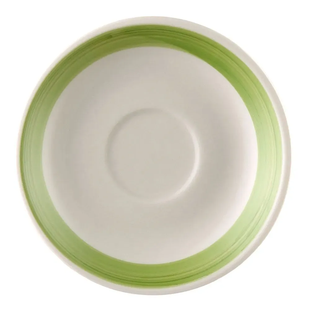 Ideal for restaurants, buffets, or catering services seeking elegance, the Rainbow Saucer is a versatile and stylish addition to any dining setting. With a diameter of 4-1/2 inches and a height of 3/4 inch, this round saucer is perfectly sized for serving a variety of dishes, from appetizers to desserts. Crafted from high-quality stoneware ceramic, the Rainbow Saucer combines durability with a sophisticated aesthetic, featuring a striking green and American white color palette that complements any table setting.
