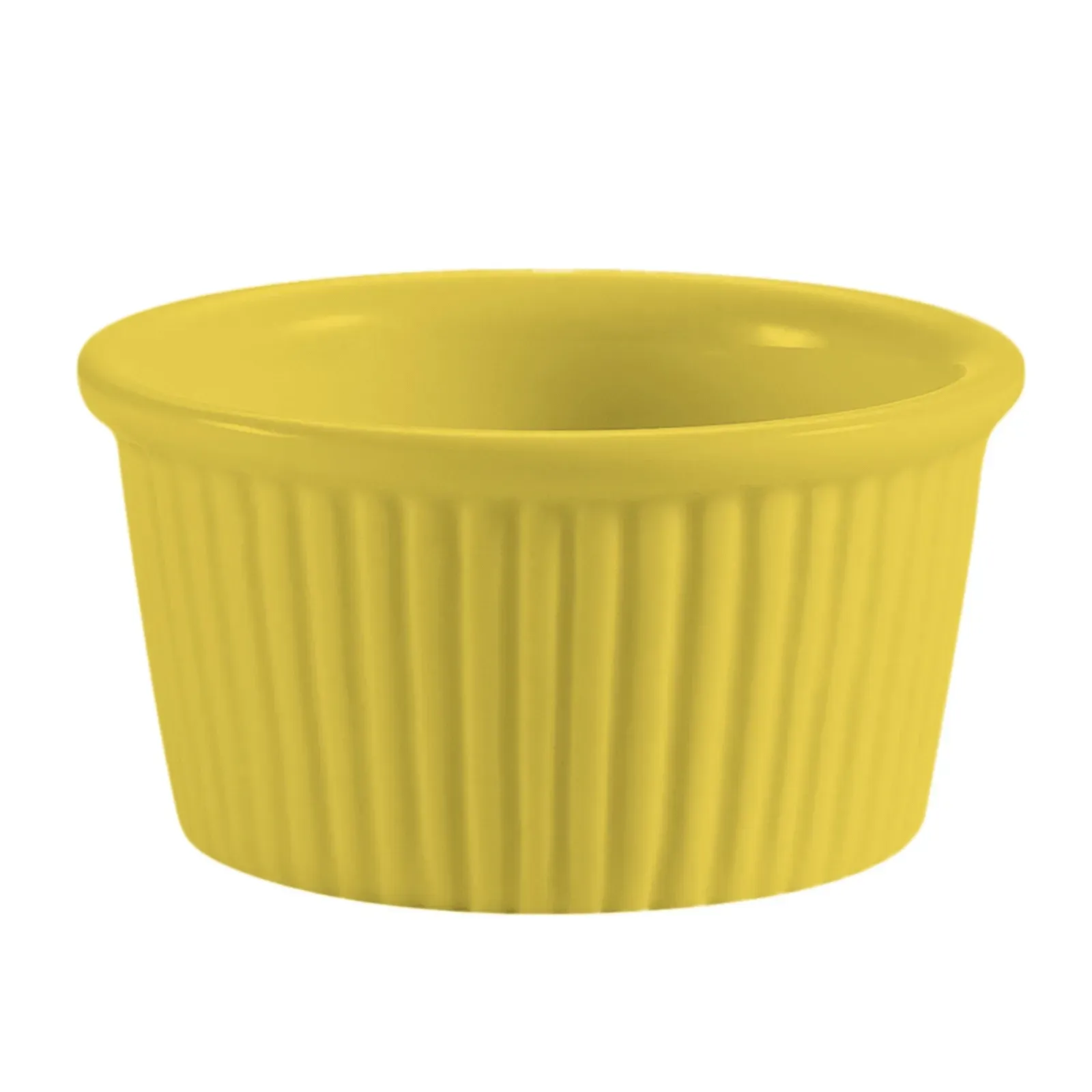 Equip for culinary success with the CAC China RKF-2-Y Ramekin/Sauce Cup. This high-quality stoneware (ceramic) cup is designed to enhance your restaurant's dining experience. With a capacity of 2 oz., it is perfect for serving individual portions of sauces, condiments, or desserts. The round, fluted design adds a touch of elegance to any table setting, while the vibrant yellow color adds a pop of brightness to your presentation.