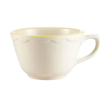 Stay ahead in culinary excellence with CAC China's SC-1G Cups. Designed for commercial restaurant use, these Seville Coffee Cups are a must-have for any establishment looking to elevate their beverage service. With a capacity of 7 oz., these round, tall cups are perfect for serving a variety of hot beverages, from coffee to tea. The scallop edge adds a touch of elegance, while the gold band on the American White stoneware enhances the presentation. Made from durable ceramic, these cups are dishwasher and oven safe, ensuring easy cleaning and versatility in the kitchen. Trust CAC China, a renowned vendor in the industry, to deliver quality and style to your restaurant. Elevate your beverage service with CAC China's SC-1G Cups.