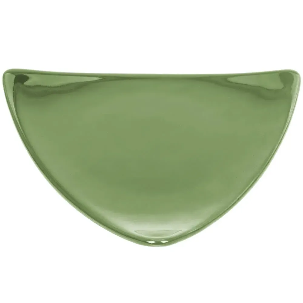 Stylish enough for both casual and fine dining establishments, the Festiware Triangular Plate is a versatile addition to any restaurant's tableware collection. Measuring 11-1/2 inches in length and width with a height of 1-1/4 inches, this uniquely shaped plate offers a modern twist to traditional dining presentations. Crafted from durable stoneware ceramic, the plate is not only visually appealing with its vibrant green hue but also highly functional.