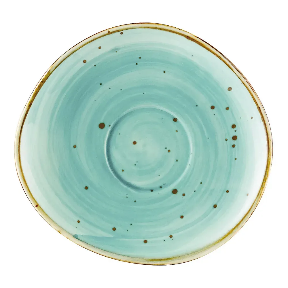 Introducing the CAC China TUS-2-TQS Saucer, a premium tool for a successful setup in your commercial restaurant. Crafted by CAC China, this saucer is designed to elevate your dining experience. Made of durable porcelain with a reactive glaze, it exudes elegance and is built to withstand the demands of a busy restaurant. The irregular round shape adds a touch of uniqueness to your table setting, while the turquoise color adds a pop of vibrancy. This saucer is dishwasher, oven, and microwave safe, ensuring convenience and versatility in your kitchen. With a size of 6-1/4" x 5-7/8", it perfectly fits the matching TUS-1-TQS cup. Whether you're serving hot beverages or delectable desserts, this saucer is a must-have for presenting your culinary creations in style. Elevate your restaurant's ambiance with the CAC China TUS-2-TQS Saucer.