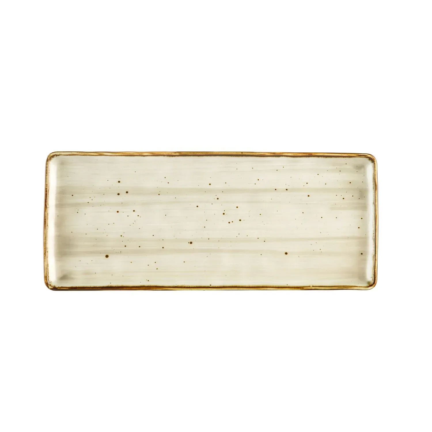 Ideal for serving beverages in a sleek, professional manner, the Tucson Platter is a versatile addition to any restaurant's tabletop presentation. Measuring 14 inches in length, 6 inches in width, and 1/2 inch in height, this rectangular platter offers ample space for artfully arranged appetizers, desserts, or even a selection of beverages. Crafted from high-quality porcelain, the Tucson Platter is both durable and elegant, featuring a reactive glaze in a sophisticated Desert Beige hue that complements any dining setting.