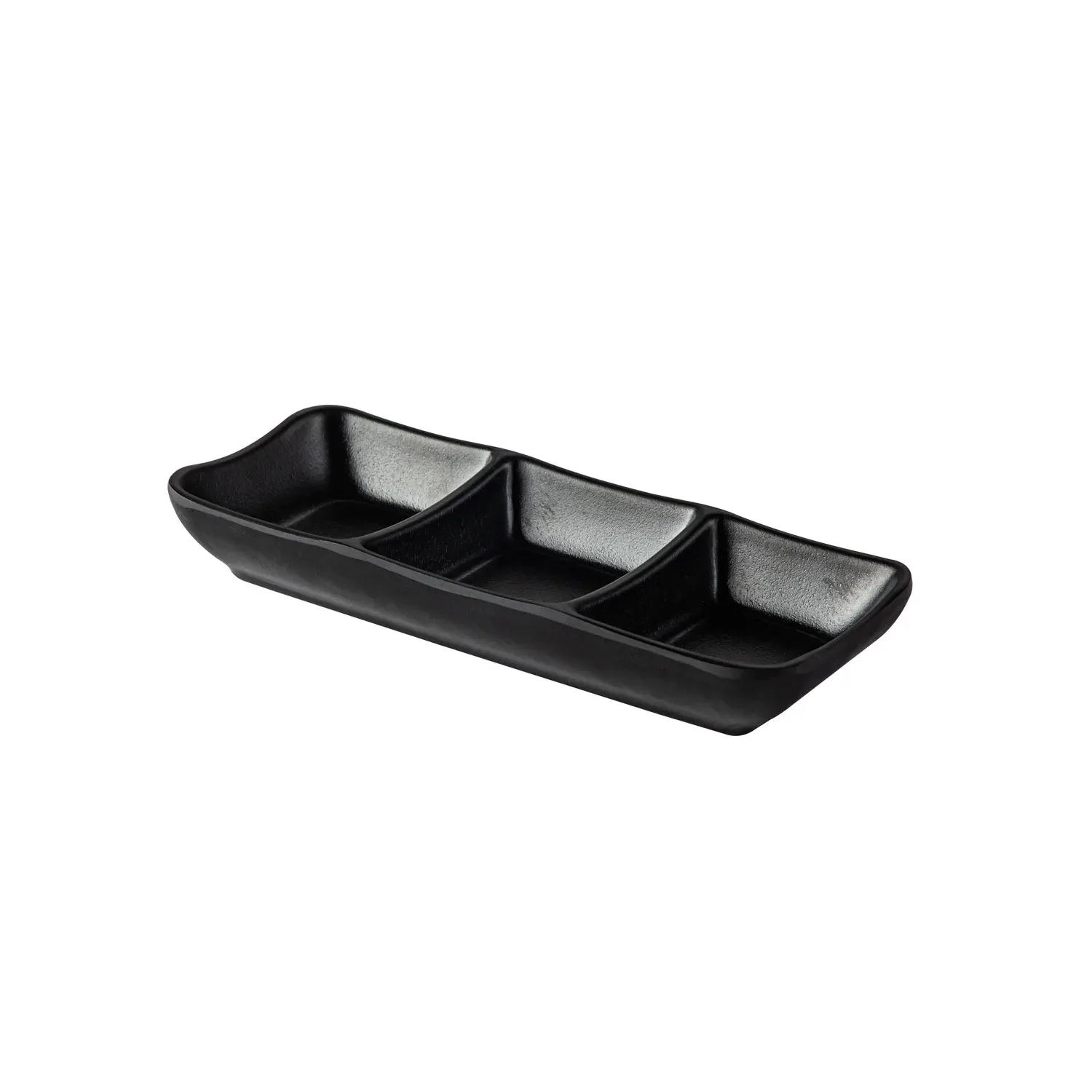 Elevate your dining experience with our sleek and versatile 3-Compartment Matte Black Rectangular Dish, designed to blend sophistication with functionality. Measuring an ideal 7-5/8 inches, this dish serves as the perfect canvas for presenting a trio of culinary delights, each compartment holding up to 1.5 ounces. Crafted for both style and utility, its matte black finish offers a modern, minimalist aesthetic that complements any table setting, whether you're hosting an elegant dinner party or serving a casual meal. The thoughtful design allows for seamless portion control and the opportunity to showcase your culinary creativity by presenting a variety of flavors and textures side by side. Ideal for serving appetizers, sauces, condiments, or even a selection of gourmet salts, this dish is an essential addition to any food enthusiast's collection. With its durable construction and stylish appeal, this 3-Compartment Matte Black Rectangular Dish not only meets the highest standards of quality but also adds a touch of contemporary elegance to your dining repertoire. Transform ordinary meals into extraordinary experiences and impress your guests with your attention to detail and commitment to quality.