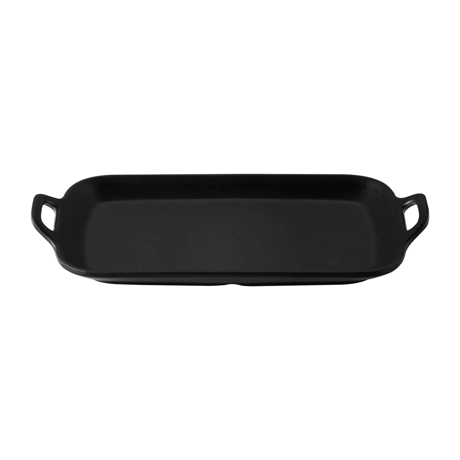 Elevate your dining experience with our sleek and sophisticated matte black serving platter, meticulously crafted for those who appreciate elegance in presentation. This rectangular platter, measuring 10-3/8" by 5-1/2", offers the perfect canvas for showcasing your culinary creations, making it an essential addition to any stylish table setting. Designed with dual handles, this platter ensures easy and stable transport from kitchen to table, enhancing both functionality and style. Its minimalist matte black finish complements a variety of tableware, from modern to traditional, allowing your dishes to take center stage. Ideal for serving an array of appetizers, entrees, or desserts, this platter is as versatile as it is chic. Whether hosting an intimate dinner party or a grand celebration, impress your guests with a presentation that speaks volumes of your taste and attention to detail. Crafted for durability and timeless appeal, this serving platter is more than just a dish; it's a statement piece that transforms everyday dining into an extraordinary culinary showcase.