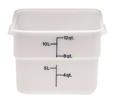 Stay competitive in culinary excellence with Cambro's 12SFSP148 Food/Beverage Storage Container. Designed for commercial restaurant use, this container is a must-have for any professional kitchen. With a capacity of 12 quarts, it provides ample space to store and transport food and beverages. The poly square construction ensures durability and longevity, making it perfect for heavy-duty use. The white color adds a clean and professional look to your kitchen. Whether you need to store ingredients, marinate meats, or transport soups and sauces, this container has got you covered. Its secure lid ensures a tight seal, keeping your food fresh and preventing leaks. Invest in Cambro's 12SFSP148 Food/Beverage Storage Container and elevate your restaurant's efficiency and organization.