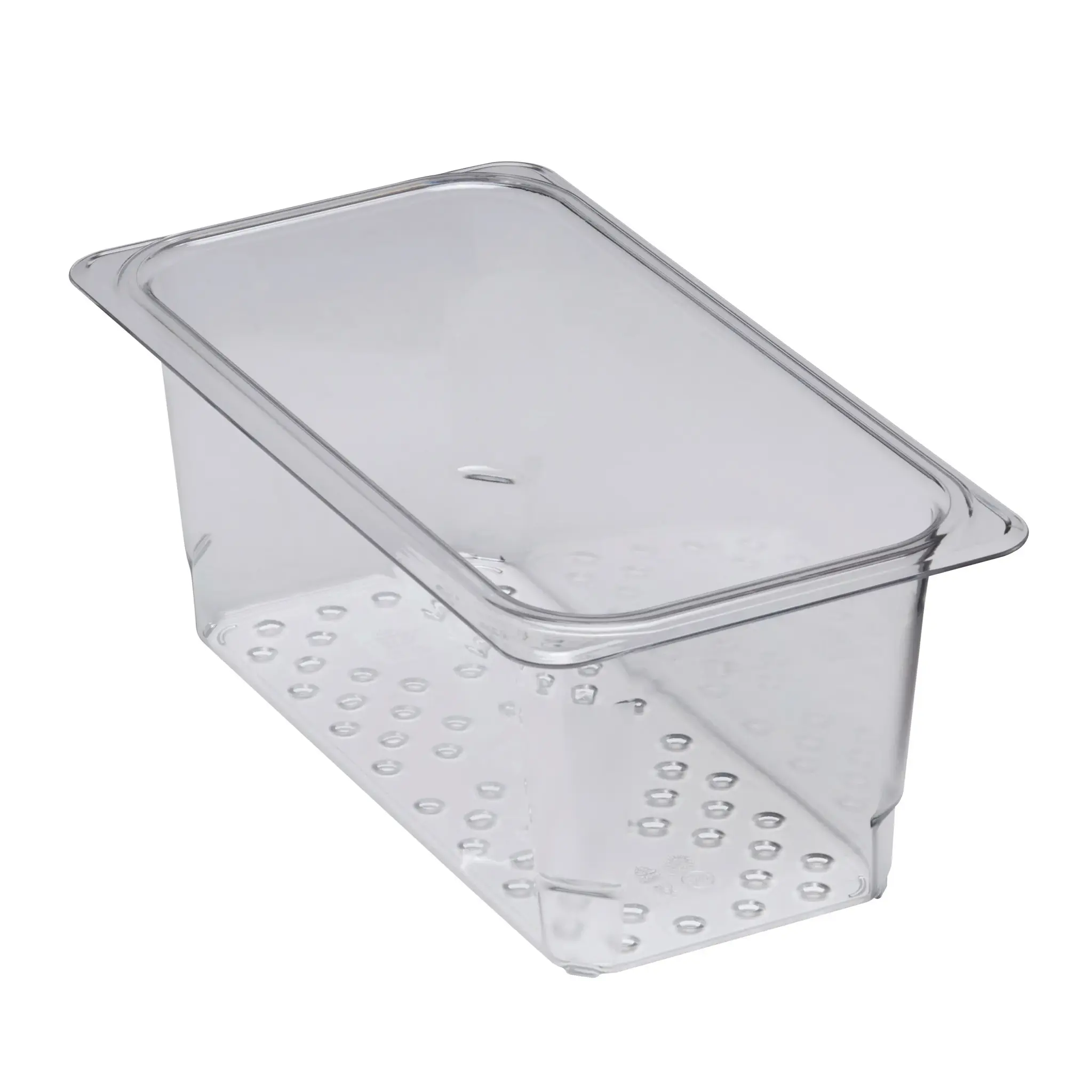 Innovate in the art of food service with Cambro's 35CLRCW135 Food/Beverage Storage Container. Designed for commercial restaurant use, this container is a game-changer in food storage. The clear Camwear construction allows for easy visibility, ensuring quick identification of contents and reducing the risk of cross-contamination. The 1/3 X 5" food pan colander is a standout feature, allowing you to drain excess liquids from your ingredients effortlessly. Whether you're storing prepped ingredients or leftovers, this container is a must-have for any commercial kitchen. Elevate your food storage game with Cambro's 35CLRCW135 Food/Beverage Storage Container.