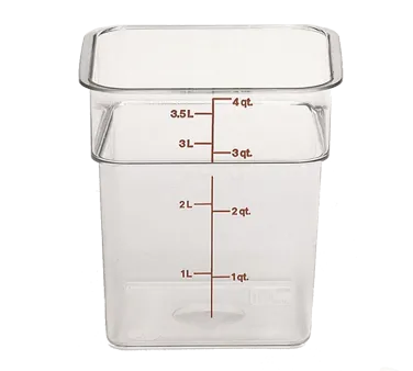Introducing the Cambro 4SFSCW135 Food/Beverage Storage Container, a must-have for commercial restaurants seeking precision in every task. With a generous 4-quart capacity, it provides ample space for storing ingredients, prepped meals, or leftovers. The clear Camwear construction allows for easy visibility of contents, ensuring efficient inventory management. Made by Cambro, a trusted name in food and beverage storage, this container is built to withstand the daily hustle and bustle of a busy kitchen. Its durable design and tight-fitting lid keep food fresh and protected, reducing waste and saving money. Whether you need to store dry goods, liquids, or prepared dishes, the Cambro 4SFSCW135 Food/Beverage Storage Container is the perfect solution for maintaining organization and efficiency in your commercial restaurant.