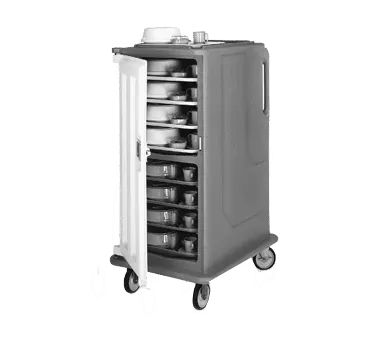 Maximize efficiency in the kitchen with the Cambro MDC1418T16615 Cabinet, Meal Tray Delivery. Designed for commercial restaurant use, this tall profile meal delivery cart is a game-changer. With its two compartments and the ability to hold up to 16 trays measuring 14" x 18", this cart ensures smooth and organized meal delivery. The molded-in handles, one on each end, make it easy to maneuver, while the 6" stainless steel casters provide stability and mobility. The charcoal gray color with a cream door adds a touch of elegance to any restaurant setting. Made by Cambro, a trusted vendor in the industry, this cabinet is NSF-approved, guaranteeing its quality and safety. Upgrade your restaurant's meal delivery system with the Cambro MDC1418T16615 Cabinet, Meal Tray Delivery, and experience enhanced efficiency and customer satisfaction.