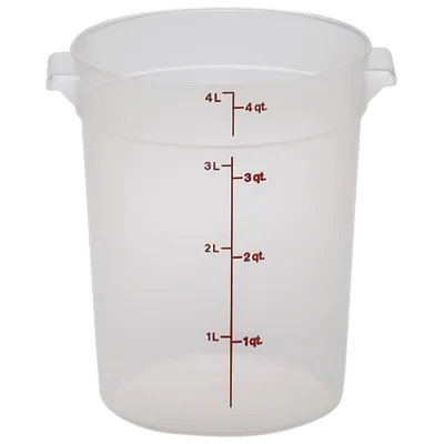 Elevate dining experience daily with Cambro's RFS4PP190 Food/Beverage Storage Container. Designed for commercial restaurant use, this round 4-quart translucent container is a must-have for any professional kitchen. The durable construction ensures long-lasting performance, while the translucent design allows for easy identification of contents, saving you time and effort. This container is perfect for storing and transporting ingredients, prepped food, and even liquids. Its tight-sealing lid keeps food fresh and prevents leaks, making it ideal for busy restaurant kitchens. Whether you're storing leftovers, marinating meats, or organizing your pantry, this Cambro storage container is a reliable and versatile solution. Invest in quality and efficiency with Cambro's RFS4PP190 Food/Beverage Storage Container.