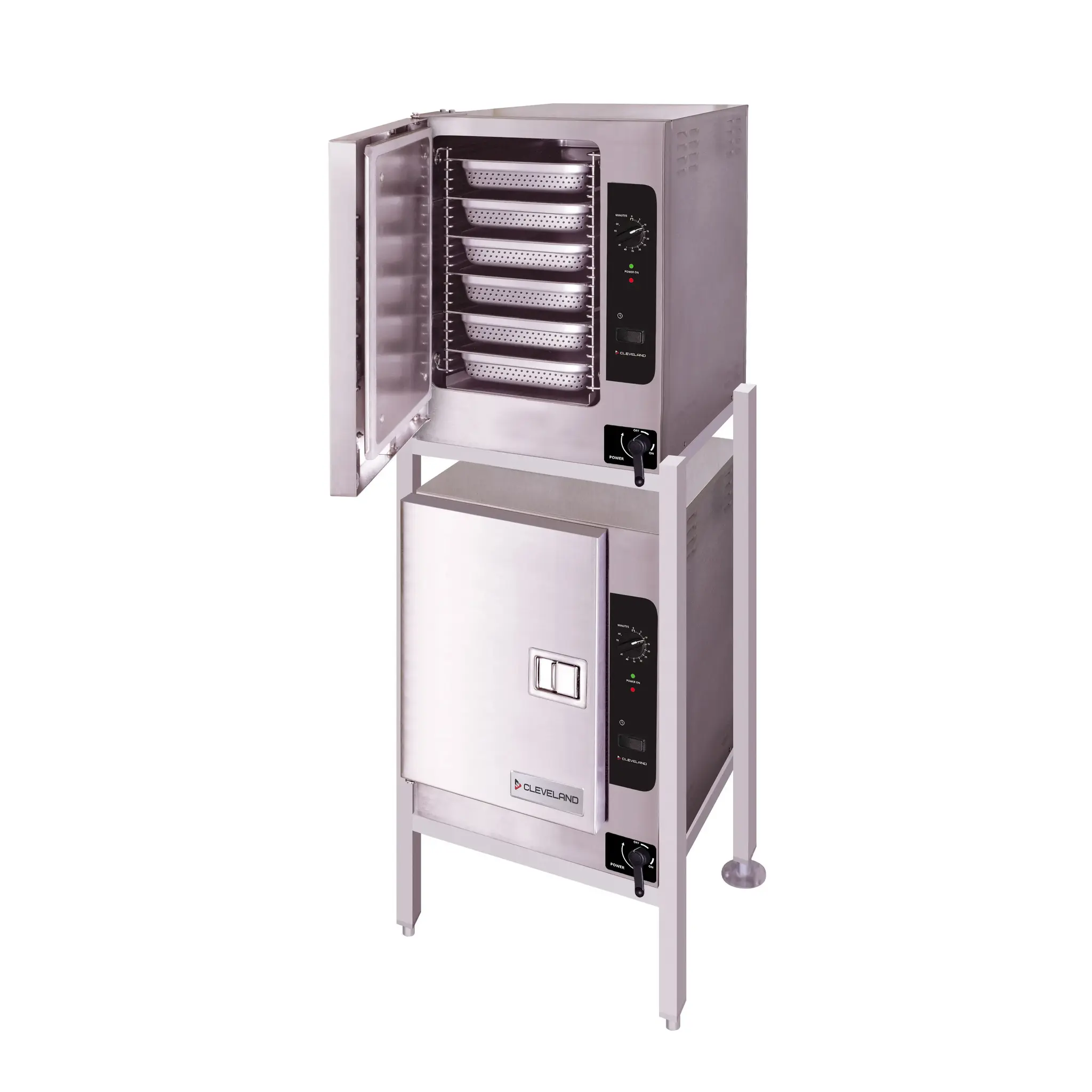 Introducing the Cleveland (2) 22CET66.1 Steamer, Convection, Electric, Boilerless, Floor Model. Ensure precision in every task with this top-of-the-line commercial restaurant equipment. Designed by Cleveland, a trusted vendor in the industry, this double-stacked convection steamer is perfect for busy kitchens. With a capacity of (6) full-size pans per compartment, it allows for efficient cooking of large quantities of food. The SureCook controls and 60-minute electro-mechanical timer ensure precise cooking times, while the manual bypass switch allows for continuous steaming. The left-hand hinged door and controls on the right provide easy access and operation. The automatic drain and water level controls, along with the KleanShield interior, make cleaning a breeze. Made with a stainless steel exterior and equipped with adjustable legs, this steamer is not only durable but also easy to move and position. UL, cUL, NSF, and ENERGY STAR certified, this Cleveland steamer is a reliable and energy-efficient choice for any commercial restaurant.