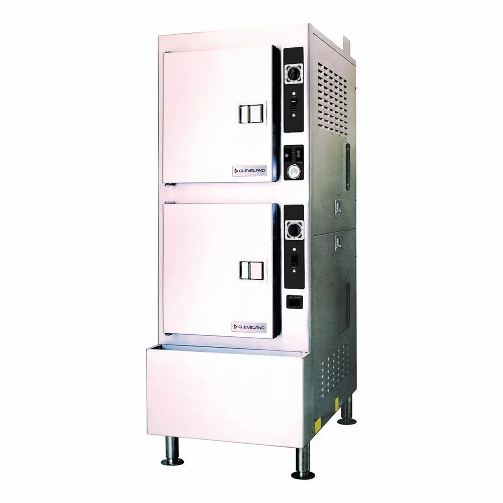 Elevate dining experience daily with the Cleveland 24CGP10 Steamer, Convection, Gas, Floor Model. This powerful and efficient steamer is designed to meet the demands of a commercial restaurant setting. With its two compartments, each capable of holding five 12 x 20 x 2 1/2 pans, you can easily cook large quantities of food simultaneously. The manual controls and 60-minute mechanical timer allow for precise cooking, while the steam shut-off switch ensures safety and convenience. The left-hand hinged door and controls on the right make it easy to access and operate. Made of durable stainless steel construction, this steamer is built to withstand the rigors of a busy kitchen. The split water connection and steam generator provide consistent steam production, while the 240000 BTU boiler delivers powerful performance. Complete with 6" stainless steel legs, this steamer is ready to enhance your restaurant's efficiency and productivity.