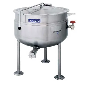 Upgrade kitchen service with the Cleveland KDL125F Kettle. Designed for commercial restaurant use, this direct steam kettle boasts a 125-gallon capacity and a full steam jacket design, ensuring efficient and even cooking. The stainless steel exterior finish not only adds a sleek and professional look to your kitchen but also provides durability and easy cleaning. Equipped with an open tri-leg base, flanged feet, and a faucet bracket, this kettle offers stability and convenience during operation. The 2" tangent draw-off and strainer, along with the spring assist cover, make draining and serving a breeze. With a 35 psi rating, this kettle delivers powerful steam for quick cooking times. Upgrade your kitchen with the Cleveland KDL125F Kettle and experience enhanced efficiency and productivity in your commercial restaurant.