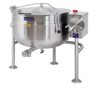 Introducing the Cleveland KDL40TSH Kettle, Direct Steam, Tilting a premium tool for culinary excellence. This short series steam jacketed kettle is designed for commercial restaurant use, offering a 40-gallon capacity and a full steam jacket design. With a 35" rim height and mounted on an open tri-leg base, this kettle provides convenience and stability. The stainless steel exterior finish ensures durability and easy cleaning, while the flanged feet offer additional support. The steam control valve allows for precise temperature regulation, and the 50 psi rating ensures efficient cooking. Whether you're simmering soups, boiling pasta, or steaming vegetables, this kettle delivers exceptional performance. Elevate your culinary creations with this top-of-the-line steam jacketed kettle.