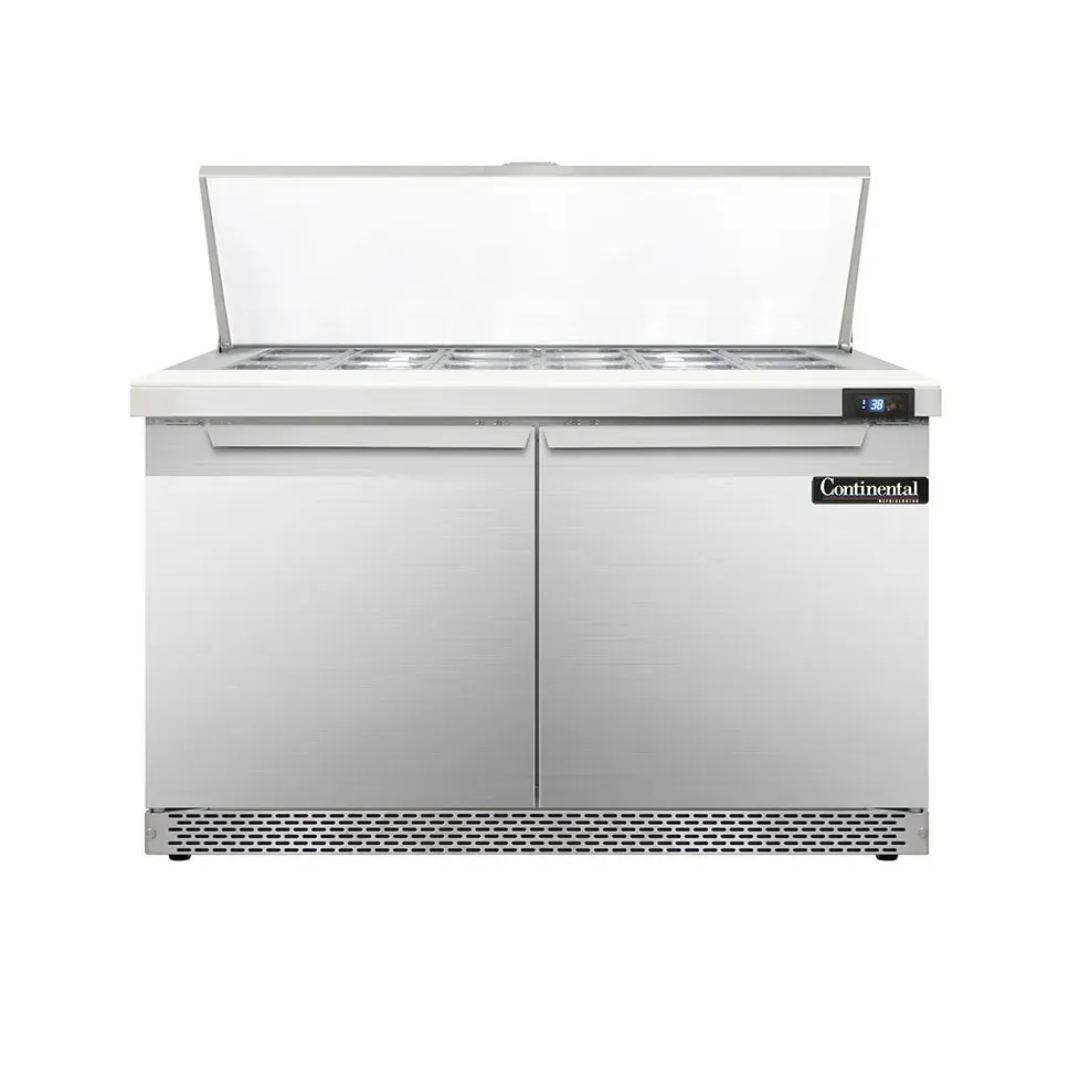 Cook with confidence using the Continental Refrigerator D48N18M-FB Refrigerated Counter, Mega Top Sandwich / Salad Unit. This designer line mighty top sandwich unit is perfect for commercial restaurant use. With its front breather and stainless steel construction on the top, front, sides, and interior, this unit is built to withstand the demands of a busy kitchen. The unit features two sections, with 18 1/6 size x 4" deep pans and a 10" cutting board, providing ample space for preparing sandwiches and salads. The two field rehingeable doors make it easy to access the ingredients, while the electronic control with digital display and hi-low alarm ensure precise temperature control and food safety. The rear-mounted self-contained refrigeration system with a 1/5 hp compressor keeps your ingredients fresh and cool. With its durable construction and convenient features, the Continental Refrigerator D48N18M-FB is a reliable and efficient choice for any commercial kitchen.