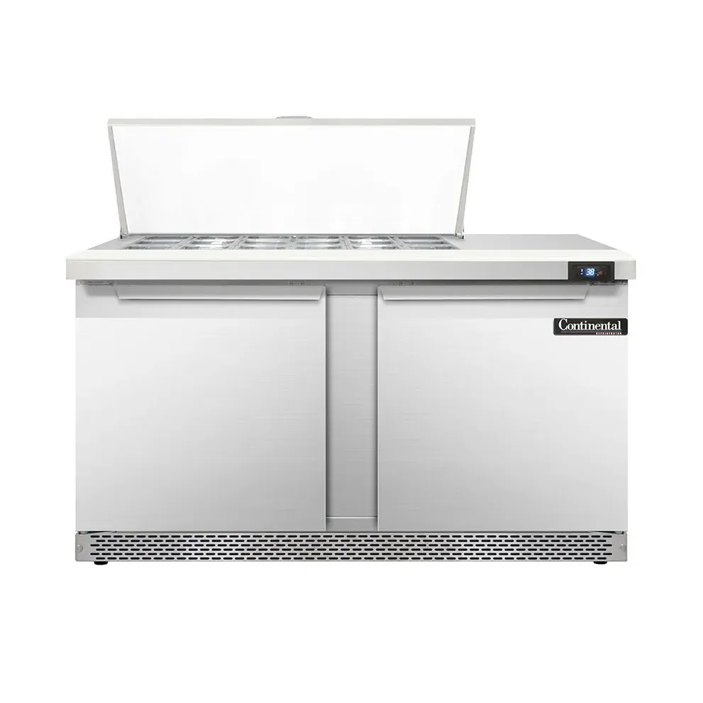 Realize kitchen dreams with the Continental Refrigerator D60N18M-FB Refrigerated Counter, Mega Top Sandwich / Salad Unit. This designer line mighty top sandwich unit is perfect for commercial restaurant use. With its front breather and stainless steel construction on the top, front, sides, and interior, this unit is built to withstand the demands of a busy kitchen. The unit features two sections and comes with 18 1/6 size pans that are 4" deep, along with a convenient 10" cutting board. The two field rehingeable doors make it easy to access the contents, while the electronic control with digital display and hi-low alarm ensure precise temperature control and food safety. The rear-mounted self-contained refrigeration system with a 1/4 HP compressor keeps your ingredients fresh and ready to use. With its sleek design and practical features, the Continental Refrigerator D60N18M-FB is a must-have for any commercial kitchen.