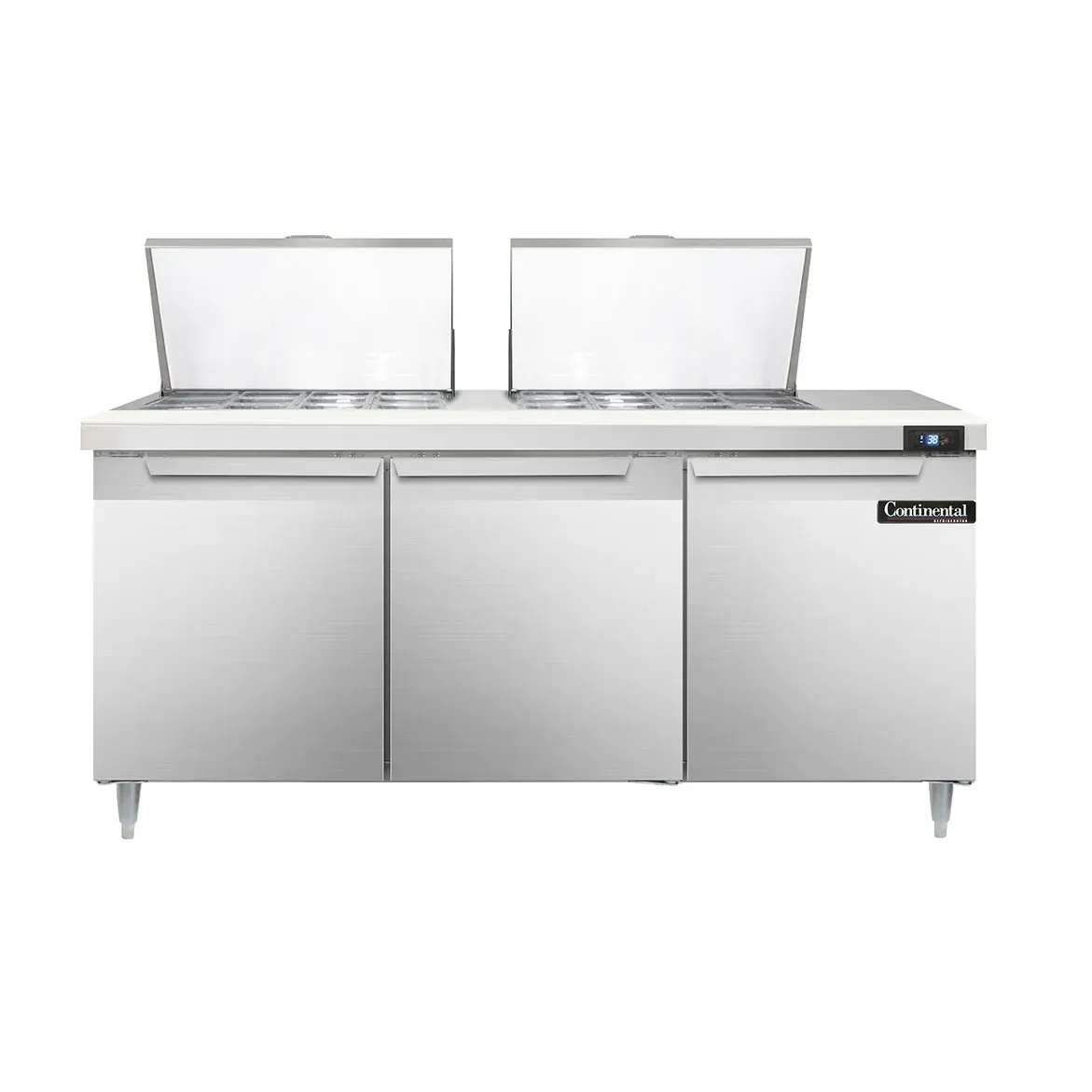 Culinary excellence in every dish starts with the Continental Refrigerator D72N24M Refrigerated Counter, Mega Top Sandwich / Salad Unit. This designer line mighty top sandwich unit is a must-have for any commercial restaurant. With its spacious 72" width and three-section design, it offers ample storage and organization for your ingredients. The unit comes with 24 1/6 size pans, each 4" deep, and a convenient 10" cutting board for easy food preparation. The stainless steel construction of the top, front, sides, and interior ensures durability and easy cleaning. The electronic control with a digital display allows for precise temperature management, while the hi-low alarm ensures food safety. The rear-mounted self-contained refrigeration system, powered by a 1/4 HP motor, keeps your ingredients fresh and ready for use. With adjustable legs for easy leveling and a field rehingeable door design, this unit offers flexibility and convenience. Elevate your culinary creations with the Continental Refrigerator D72N24M Refrigerated Counter, Mega Top Sandwich / Salad Unit.