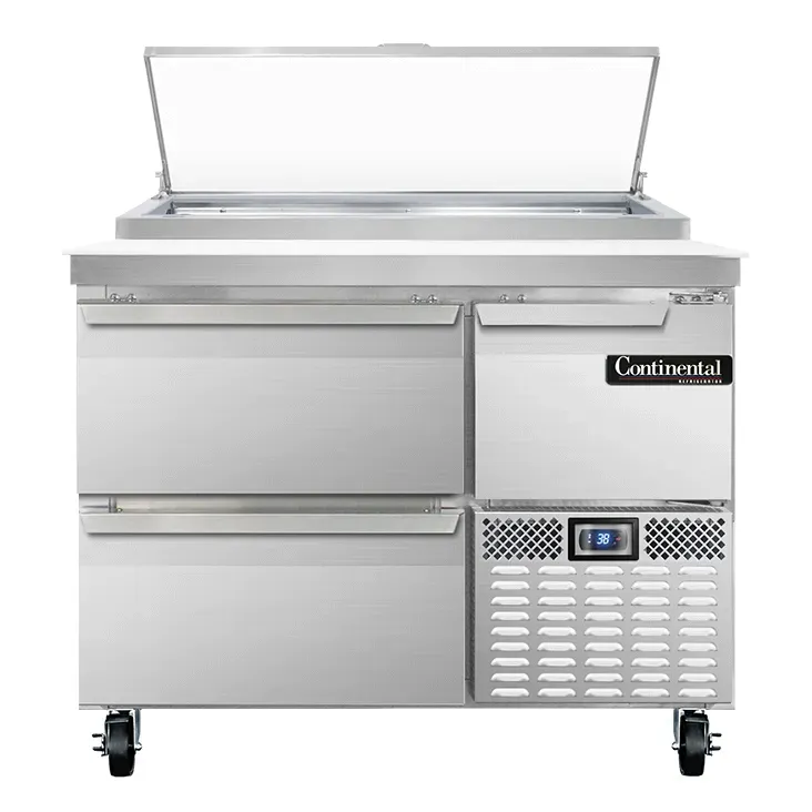 Cook with confidence and flair using the Continental Refrigerator PA43N-D Refrigerated Counter Pizza Prep Table. This one-section table is designed to meet the needs of busy commercial restaurants, offering a spacious 43" work top made of durable 300 series stainless steel. The table also features a convenient 19" poly cutting board for easy food preparation. With a capacity of 12.0 cu ft, this table provides ample storage space for your ingredients. The two drawers can hold two 12 x 20 x 6 pans each (pans supplied by others), allowing you to keep your toppings and ingredients organized and easily accessible. The electric condensate evaporator ensures efficient operation, while the stainless steel front and end panels add a sleek and professional look to your kitchen. The aluminum interior is easy to clean and maintain, and the electronic controller with digital display allows for precise temperature control. With side-mounted refrigeration and a powerful 1/2 HP motor, this pizza prep table is built to handle the demands of a busy restaurant kitchen. Trust Continental Refrigerator for reliable, high-quality equipment that will enhance your restaurant's efficiency and productivity.