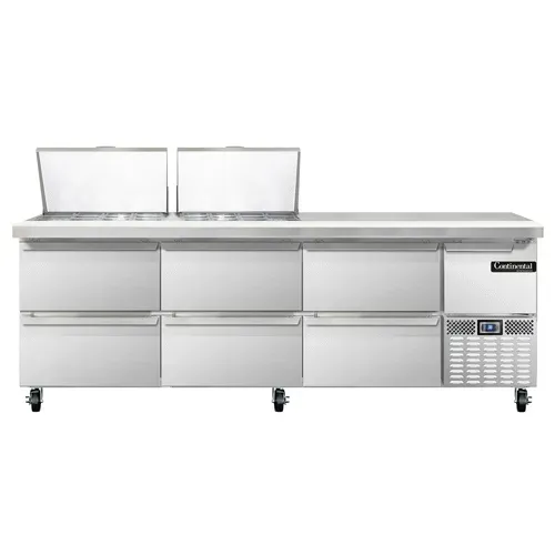 Fuel your restaurant's success with the Continental Refrigerator RA93N24M-D Refrigerated Counter, Mega Top Sandwich / Salad Unit. This top-of-the-line unit is designed to meet the demands of a busy commercial kitchen. With its 93" width and 300 series stainless steel top, it provides ample space for food preparation and storage. The unit comes with 24 non-recessed pans, allowing you to easily organize and access your ingredients. The stainless steel front and sides, along with the galvanized steel case back, ensure durability and longevity. Inside, the aluminum interior is easy to clean and maintain. The unit features a 10" deep nylon cutting board, perfect for slicing and dicing. With six drawers, including top drawers that hold one 12" x 20" pan each and bottom drawers that hold two 12" x 20" pans each, you'll have plenty of storage options. The half-height field rehingeable door provides convenience and accessibility. The electronic controller with digital display allows for precise temperature control. Powered by a 1/2 HP side-mounted refrigeration system, this unit ensures optimal cooling performance. NSF and cETLus certified, this unit is made in the USA and guarantees quality and safety. Upgrade your restaurant's kitchen with the Continental Refrigerator RA93N24M-D Refrigerated Counter, Mega Top Sandwich / Salad Unit and experience enhanced efficiency and productivity.