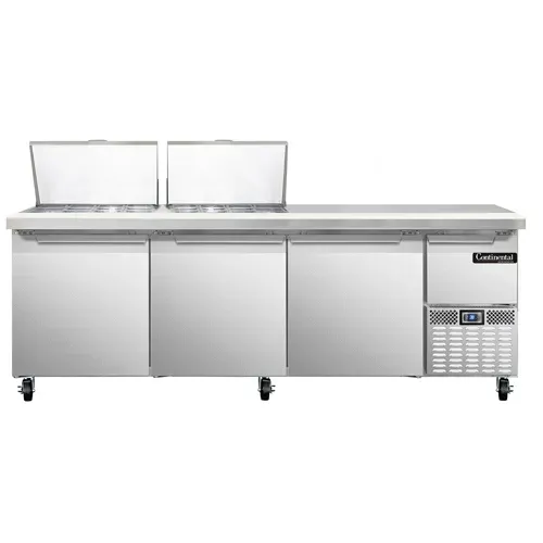 Deliver food perfection with the Continental Refrigerator RA93N24M Refrigerated Counter, Mega Top Sandwich / Salad Unit. This top-of-the-line unit is designed to meet the demanding needs of commercial restaurants. With its 93" width and 300 series stainless steel top, it provides ample space for food preparation and storage. The unit comes with 24 non-recessed pans, allowing you to organize and display your ingredients with ease. The stainless steel front and sides, along with the galvanized steel case back, ensure durability and longevity. Inside, the aluminum interior is easy to clean and maintain. The unit also features a 10" deep nylon cutting board, perfect for slicing and dicing. With three full and one half height field rehingeable doors, accessing your ingredients has never been easier. The electronic controller with digital display allows for precise temperature control, ensuring your food stays fresh. Powered by a 1/2 HP side-mounted refrigeration system, this unit is both efficient and reliable. NSF and cETLus certified, this Made in USA product is a must-have for any commercial restaurant looking to deliver food perfection.