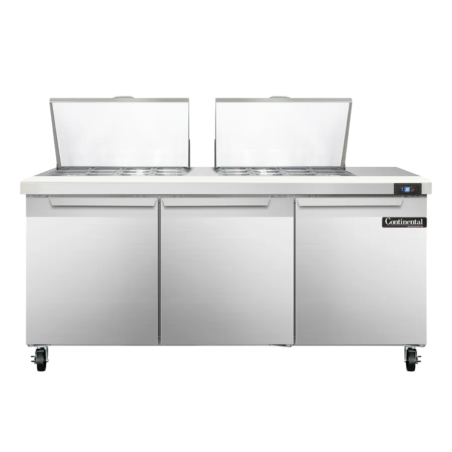 Cook with confidence with the Continental Refrigerator SW72N24M Refrigerated Counter, Mega Top Sandwich / Salad Unit. This mighty top sandwich unit is designed to meet the demands of a busy commercial restaurant. With a spacious 72" width and a generous 20.6 cu ft capacity, it provides ample storage for all your ingredients. The unit features three sections, each equipped with 24 1/6 size x 4" deep pans and a convenient 10" cutting board, allowing you to easily assemble sandwiches and salads. The stainless steel top, front, and end panels ensure durability and easy cleaning, while the aluminum back and interior provide excellent insulation. The electronic control with a digital display allows for precise temperature management, and the hi-low alarm ensures food safety. With rear-mounted self-contained refrigeration and a 1/4 HP compressor, this unit is both efficient and reliable. Made in the USA and certified by cETLus and NSF, the Continental Refrigerator SW72N24M is the perfect addition to any commercial kitchen.