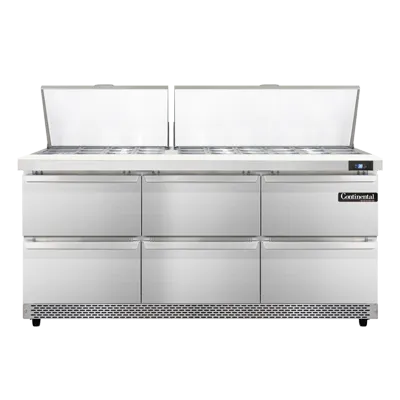 Cooking at its finest begins with the Continental Refrigerator SW72N30M-FB-D Refrigerated Counter, Mega Top Sandwich/Salad Unit. This top-of-the-line unit is designed to meet the demands of a busy commercial restaurant kitchen. With a spacious 72" width and a generous 20.6 cu ft capacity, this three-section unit provides ample storage for all your ingredients. The unit comes equipped with (30) 1/6 size x 4" deep pans, each with a 10" cutting board, allowing for efficient food preparation. The (6) drawers are designed to accommodate (1) 12 x 18 x 6 pan per drawer or (1) 1/2 x 6 & (1) 1/3 x 6 pans per drawer. The stainless steel top, front, and end panels ensure durability and easy cleaning, while the aluminum back and interior provide excellent insulation. The electronic control with a digital display allows for precise temperature management, and the hi-low alarm ensures food safety. With rear-mounted self-contained refrigeration and 3-3/4" casters, this unit is easy to move and position in your kitchen. Made in the USA and certified by cETLus and NSF, you can trust the quality and reliability of Continental Refrigerator. Upgrade your kitchen with the Continental Refrigerator SW72N30M-FB-D Refrigerated Counter, Mega Top Sandwich/Salad Unit and experience the difference in performance and efficiency.