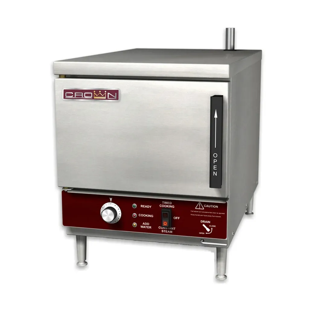 Crafted by Crown Steam, a trusted name in the industry, this steamer guarantees durability and reliability. Its compact design ensures it fits seamlessly into any kitchen layout, maximizing space efficiency.