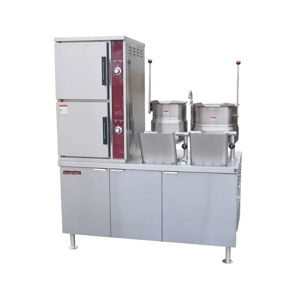 The Crown Convection Steamers with two tilting kettles on a modular gas-fired steam boiler base are engineered for high-volume, commercial kitchens that require both efficiency and durability. Featuring a stainless steel type 304 exterior with a sleek #4 finish, this versatile unit is equipped with a deck-mounted faucet valve, swing nozzle, and an integral sink with a common drain, offering all-in-one convenience for seamless steam cooking. Each convection steamer is designed with doors that include a removable stainless steel inner liner and a full perimeter gasket seal to ensure a secure, airtight fit. The outer shell is crafted from a one-piece, all-welded stainless steel construction for maximum durability. The positive lock and seal mechanism, along with a stainless steel drip trough connected to the drain, effectively collects condensate when the doors are opened, keeping your kitchen clean and operational. Inside, each cooking chamber is made from all-welded type 316 stainless steel, fully insulated for optimal heat retention, and fitted with removable stainless steel pan supports for easy cleaning. The unit’s steamer controls are conveniently housed in a fully removable side panel for easy access. Each compartment is equipped with a 60-minute mechanical timer, along with ready and cooking pilot lights. Steam flow is automatically interrupted when the compartment door is opened during cooking and is instantly reactivated when the door is securely closed. At the end of each cooking cycle, an audible signal alerts the operator to ensure precise cooking times. The sturdy cabinet base features a full perimeter painted angle frame, reinforced kettle and boiler mountings, and hinged doors with magnetic latches for secure closure. The 6” (152 mm) stainless steel legs come with four adjustable flanged feet, allowing the unit to be firmly secured to the floor. Boiler controls include automatic water level control, a pressure gauge, water gauge glass, operating pressure control, safety high-limit pressure control, safety relief valve, and a cathodic protector, offering enhanced safety and performance. Certified to meet ASME standards and National Board registered, the unit’s boiler is equipped with a water treatment system, split water line, CSD-1 boiler controls, electronic ignition, and automatic blowdown, ensuring long-term reliability and efficient operation.