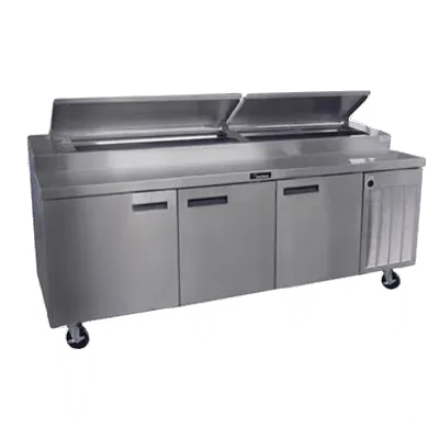 Unleash efficiency magic in all operations with the Delfield 18699PTBMP Refrigerated Counter Pizza Prep Table. Designed for commercial restaurant use, this three-section table offers a spacious 99" width and 25.87 cubic feet of refrigerated storage. With a capacity for 12 1/3 pans and three shelves, you'll have plenty of room to organize ingredients and toppings. The 18 gauge stainless steel top and refrigerated pan rail ensure durability and freshness, while the stainless steel ends add a sleek touch. The side-mounted refrigeration system, powered by two 1/5 hp motors, keeps everything at the perfect temperature. This table also features 27" doors for easy access and 6" casters for effortless mobility. With its cUL, UL, and NSF 7 certifications, you can trust the Delfield 18699PTBMP to deliver exceptional performance and reliability in your commercial kitchen.