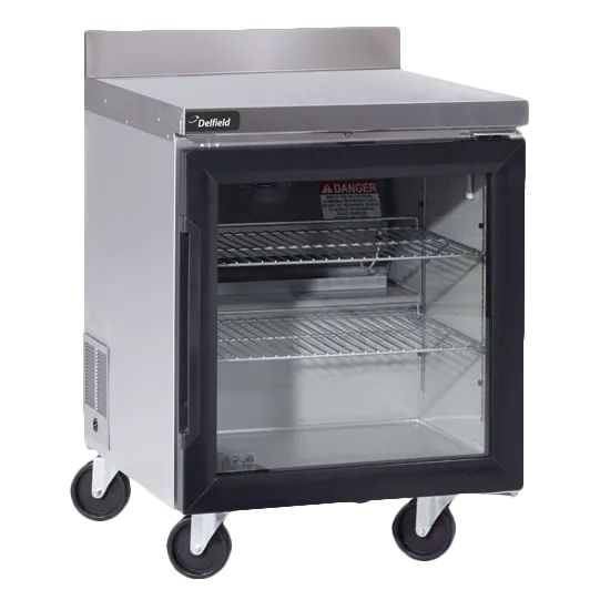 Enhance ambiance with a sophisticated addition. Introducing the Delfield GUR27BP-G Refrigerated Counter, Work Top. This coolscapes worktable refrigerator is perfect for commercial restaurant use. With its sleek stainless steel top and front, it adds a touch of elegance to any kitchen. The one-section design provides ample storage space with 6.5 cubic feet capacity. The glass door allows for easy visibility of contents, while the gray epoxy coated shelf offers convenient organization. The LED interior lighting illuminates the interior, making it easy to find what you need. The 4" backsplash helps keep the workspace clean and tidy. Equipped with a rear-mounted refrigeration system and GreenGenius R290 Hydrocarbon refrigerant, this unit is energy-efficient and environmentally friendly. The 5" casters, two of which are locking, ensure easy mobility. Trust Delfield, a reputable vendor in the industry, to deliver quality and reliability. Upgrade your restaurant's functionality and style with the Delfield GUR27BP-G Refrigerated Counter, Work Top.