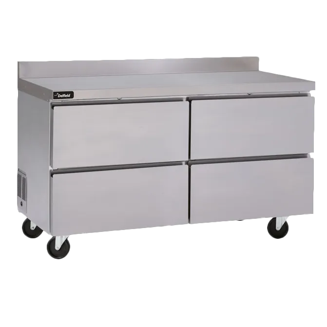 Redefine setup with a state-of-the-art addition. Introducing the Delfield GUR60BP-D Refrigerated Counter, Work Top. This coolscapes worktable refrigerator is designed to revolutionize your commercial restaurant experience. With its two-section layout and 11.7 cubic feet capacity, it offers ample storage space for your ingredients. The four drawers can hold up to 24 1/6 size pans, each 6" deep, ensuring easy organization and accessibility. The stainless steel top and front, along with the aluminum sides, provide durability and a sleek appearance. The gray coated aluminum interior sides and anodized aluminum bottom are not only easy to clean but also resistant to corrosion. Equipped with a rear-mounted refrigeration system and GreenGenius R290 Hydrocarbon refrigerant, this unit ensures efficient cooling while being environmentally friendly. The 5" casters, with two locking and two non-locking, allow for easy mobility. Trust Delfield to deliver a reliable and energy-efficient refrigerated counter that meets UL, cUL, NSF, and ENERGY STAR standards. Upgrade your restaurant setup with the Delfield GUR60BP-D Refrigerated Counter, Work Top.
