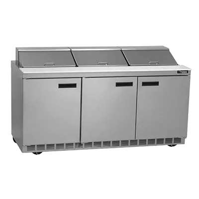 Ignite efficiency and excellence with an essential tool. Introducing the Delfield UC4472N-12 Refrigerated Counter, Sandwich / Salad Unit. This three-section unit is designed to meet the demands of a commercial restaurant setting, offering a spacious 72" width and 24.80 cubic feet of storage capacity. With three doors and a stainless steel top featuring a polyethylene cutting board and 12 1/6 size plastic pans, this unit provides ample space for preparing and storing sandwiches and salads. The stainless steel front and sides ensure durability and easy cleaning, while the ABS interior sides add an extra layer of protection. Equipped with a front-breathing rear-mounted refrigeration system and 3" casters for mobility, this unit is both efficient and convenient. Trust in Delfield's reputation for quality and reliability. Upgrade your restaurant's efficiency with the UC4472N-12 Refrigerated Counter, Sandwich / Salad Unit.