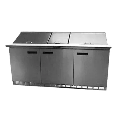 Introducing the Delfield UC4472N-30M Refrigerated Counter, Mega Top Sandwich / Salad Unit. Streamline operations effortlessly with this commercial-grade refrigerator designed specifically for restaurant use. With its reduced height and three-section design, this unit offers ample storage space while maximizing efficiency in your kitchen. The stainless steel top comes with a polyethylene cutting board and 30 plastic pans, perfect for preparing and organizing ingredients for sandwiches and salads. The stainless steel front and sides ensure durability and easy cleaning, while the ABS interior sides provide additional protection against spills and stains. Equipped with a front-breathing rear-mounted refrigeration system and a powerful 1/2 hp motor, this unit maintains consistent temperatures to keep your perishable items fresh. Complete with 3" casters for easy mobility, the Delfield UC4472N-30M is the ideal choice for any commercial restaurant looking to optimize their food preparation and storage processes.