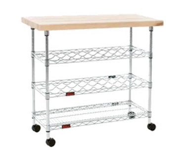 Enhance ambiance with a sophisticated addition. Introducing the Eagle Group WR1840C Cart, Liquor Wine. This versatile cart is designed to elevate the atmosphere of any commercial restaurant. With its 1-3/4" thick hardwood butcher block top, it provides a sturdy and elegant surface for serving drinks or displaying appetizers. The cart features two cradle wine racks with a chrome finish, capable of holding up to 18 bottles of wine, allowing you to showcase your extensive wine selection. The standard wire with chrome finish adds a touch of modernity to the cart's design. Equipped with two swivel and two swivel/brake decorative casters, this cart is easy to maneuver and can be securely locked in place when needed. Whether you're hosting a wine tasting event or simply need a stylish storage solution for your liquor collection, the Eagle Group WR1840C Cart is the perfect choice for enhancing the ambiance of your restaurant.