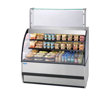 Unveil wonders of culinary exploration with the Federal Industries SSRVS5942 Display Case. Designed for commercial restaurant use, this versatile self-serve deli merchandiser is a must-have for any food establishment. With its spacious 59W x 34D x 42H dimensions, it offers ample space to showcase a wide variety of delectable treats. The self-contained refrigeration system, complete with a PTC condensate evaporator and adjustable temperature control, ensures optimal freshness and temperature control for your products. The LED horizontal top and shelf lights illuminate your offerings, while the stainless steel top service area and two tiers of adjustable solid black metal shelves provide a sleek and sturdy display. The black display deck and interior, along with the tempered glass ends, add a touch of elegance to your presentation. With its DOE 2012 compliance and cULus, UL, and UL EPH CLASSIFIED certifications, this display case is both reliable and safe. Elevate your culinary creations with the Federal Industries SSRVS5942 Display Case.