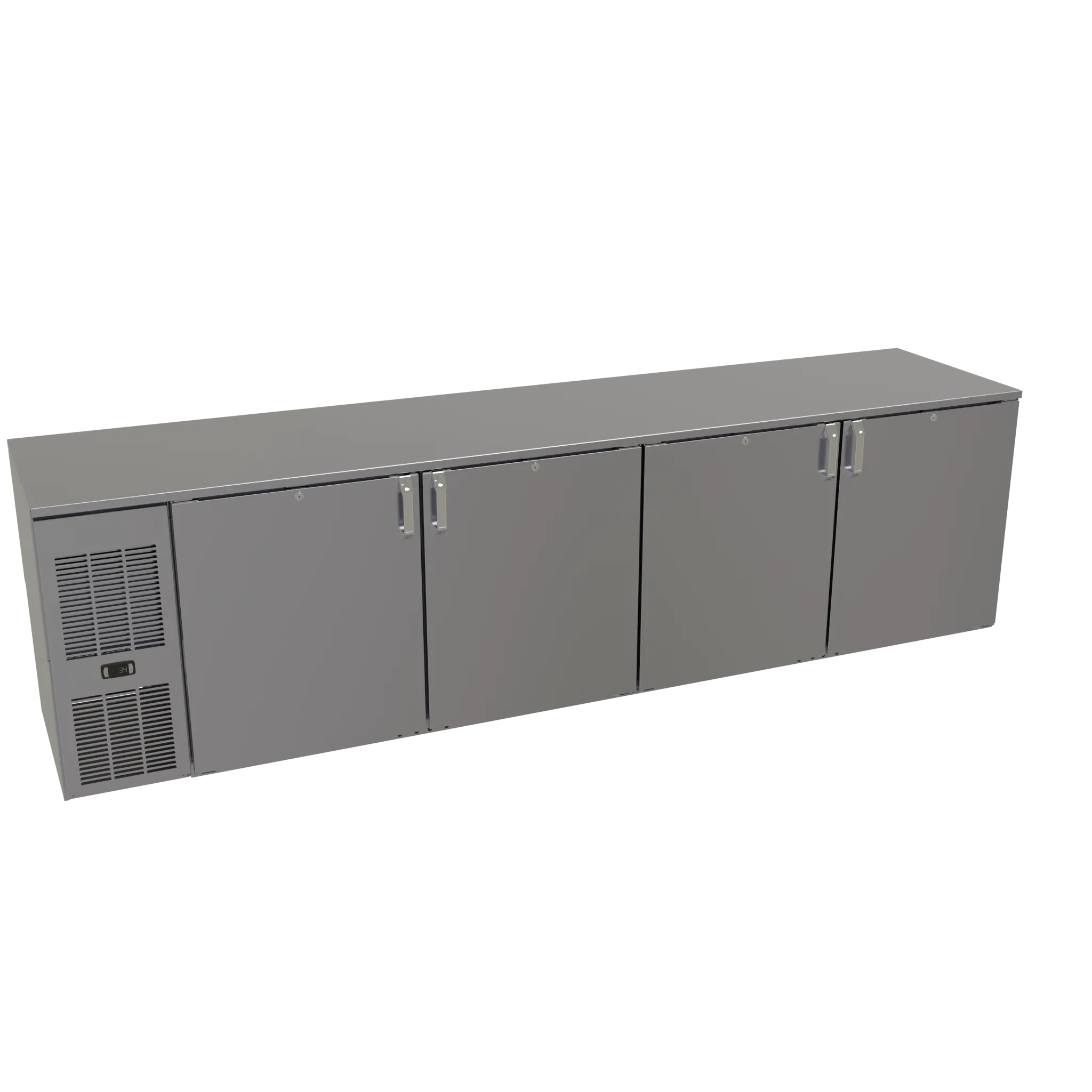 Elevate the atmosphere discreetly with the Glastender C1FL108 Back Bar Cabinet. Designed specifically for commercial restaurant use, this refrigerated cabinet is perfect for showcasing and storing beverages in style. With its low profile and sleek stainless steel interior, it seamlessly blends into any restaurant decor. The front service design allows for easy access and maintenance, while the LED interior lighting illuminates the contents, making it visually appealing to customers. The self-contained refrigeration system ensures optimal temperature control, keeping your drinks perfectly chilled. Each of the four sections features a 20" wide door opening and two adjustable shelves, providing ample storage space. This cabinet is NSF Standard 7 certified for open food storage, guaranteeing its quality and safety. Trust Glastender, a reputable vendor in the industry, to deliver a reliable and efficient back bar cabinet that enhances your restaurant's ambiance and functionality.