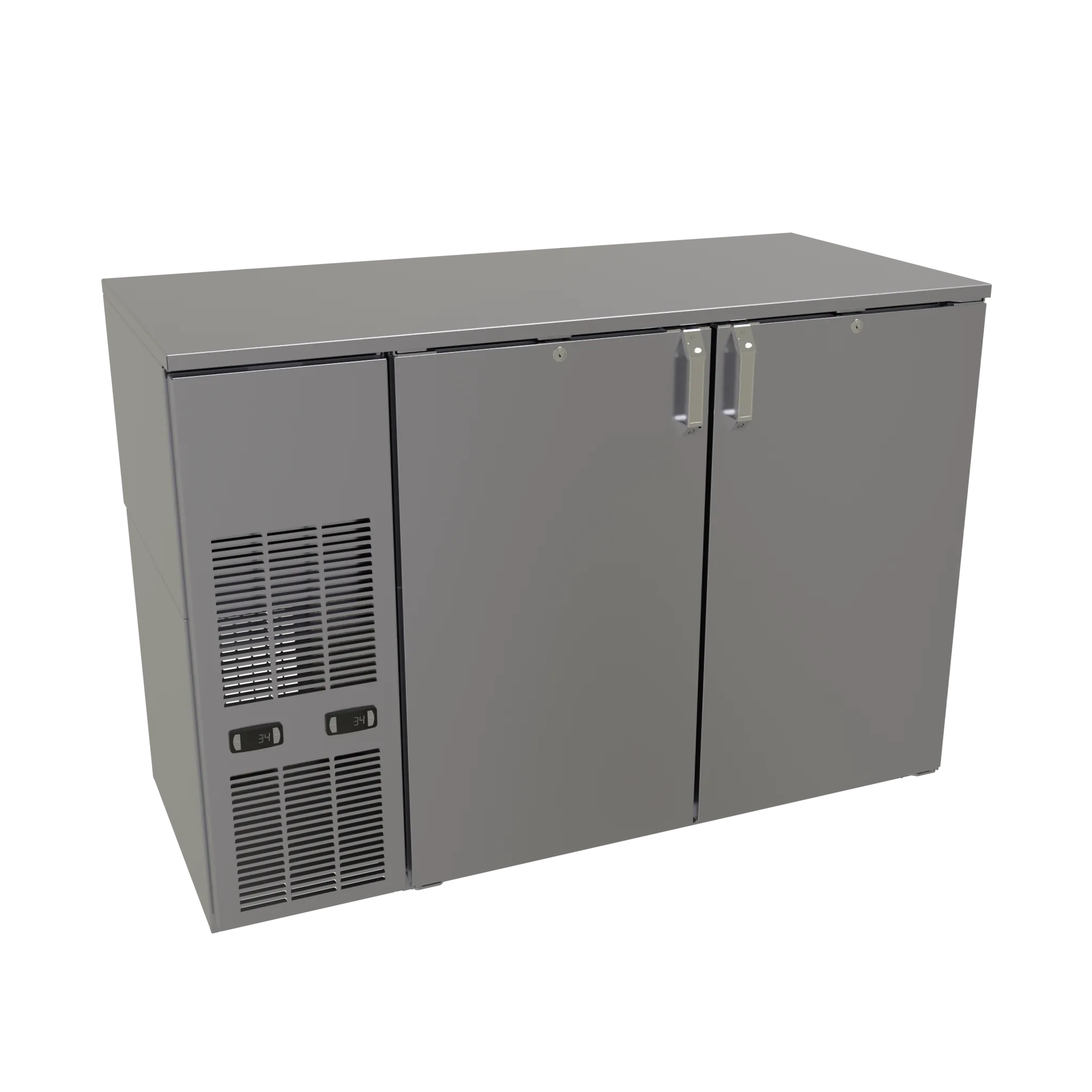 Introducing the Glastender C2FB52 Back Bar Cabinet, Refrigerated a must-have for any commercial restaurant looking to design a dynamic environment. This two-zone cooler features a bar profile and a spacious 52"W design, making it perfect for storing and displaying a wide range of beverages. With a self-contained refrigeration system and front venting, this unit ensures efficient cooling without taking up valuable space. The LED interior lighting not only enhances visibility but also adds a touch of elegance to your bar area. The stainless steel interior guarantees durability and easy cleaning, while the 1/4 HP compressor ensures reliable performance. This back bar cabinet is NSF Standard 7 certified for closed container products, ensuring compliance with food safety regulations. With its sleek design and practical features, the Glastender C2FB52 is the ideal choice for commercial restaurants looking to elevate their beverage service.