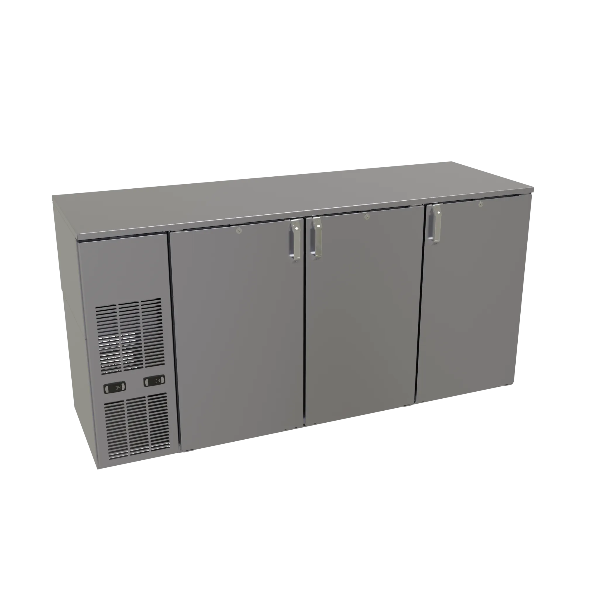 Efficient solutions for seamless service. Introducing the Glastender C2FB72 Back Bar Cabinet, Refrigerated. This commercial-grade cooler is designed to meet the demands of a busy restaurant environment. With its two-zone cooling system and front service design, it allows for easy access and efficient organization of beverages. The bar profile and 72" width provide ample storage space, while the three-section layout and 16" wide door openings make it convenient to retrieve items. The self-contained refrigeration system ensures optimal temperature control, while the LED interior lighting enhances visibility. Made with a stainless steel interior, this back bar cabinet is not only durable but also easy to clean. It is NSF Standard 7 certified for closed container products, ensuring its compliance with food safety regulations. With its front venting and cETLus and ETL-Sanitation certifications, this Glastender Back Bar Cabinet is a reliable and efficient choice for any commercial restaurant.