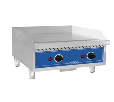 Master the art of cooking with the Globe GEG24 Electric Countertop Griddle. This high-quality griddle is designed to meet the demands of a commercial restaurant kitchen. With its stainless steel plate and cool-to-touch front edge, this griddle ensures durability and safety. The 1/2" thick polished cooking surface provides even heat distribution for perfect cooking results every time. The griddle features an on/off switch for each element, allowing for precise temperature control. The thermostatic controller ensures accurate temperature settings, while the removable catch tray makes cleaning a breeze. The splash guard on three sides prevents any mess or spills, and the spatula-wide trough allows for easy food flipping. With its adjustable feet, this griddle can be easily leveled on any countertop. Powered by 208/240v/60/1-ph, this griddle is a powerful addition to any commercial kitchen. Trust Globe to deliver exceptional quality and performance.