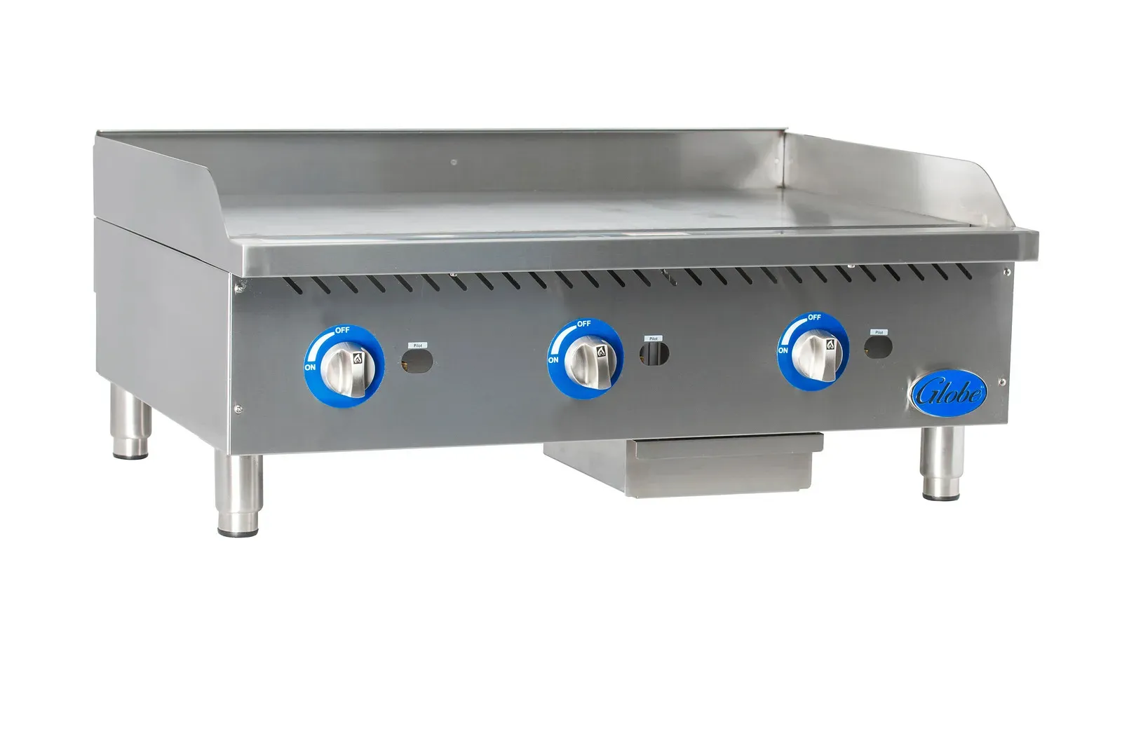 Unleash culinary creativity with the Globe GG36G Gas Countertop Griddle. This 36" wide griddle is a must-have for any commercial restaurant looking to elevate their cooking game. The 1" highly polished griddle plate is fully welded to a stainless steel frame, ensuring durability and even heat distribution. With manual controls every 12", you have precise control over the cooking process. The individual adjustable pilots with front access make ignition a breeze. The 4" wide grease trough helps keep your workspace clean and organized. The stainless steel double wall construction with an extended cool-to-touch front edge ensures safety and efficiency. The griddle comes with 4" adjustable heavy-duty stainless steel legs for stability. With a total BTU of 90000, this griddle can handle any cooking task with ease. Whether you're cooking up pancakes, burgers, or stir-fry, the Globe GG36G Gas Countertop Griddle is the perfect addition to your commercial kitchen.