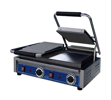 Unleash gastronomic brilliance with the Globe GSGDUE10 Sandwich/Panini Grill. This double countertop electric grill is a game-changer for commercial restaurants. Its cast iron smooth plates provide even heat distribution, ensuring perfectly grilled sandwiches and paninis every time. The 20" continuous bottom plate and two split 10" upper plates offer ample cooking space to meet high-demand orders. With a temperature control that reaches up to 570 F, you have full control over the cooking process. The spring hinge with adjustable tension allows for easy operation and consistent pressure on your sandwiches. The stainless steel construction ensures durability and easy cleaning, while the removable catch tray keeps your workspace tidy. Equipped with rubber feet, this grill stays securely in place during use. With 3200 watts of power, this NSF and cULus certified grill is a reliable addition to any commercial kitchen. Upgrade your sandwich game with the Globe GSGDUE10 Sandwich/Panini Grill.