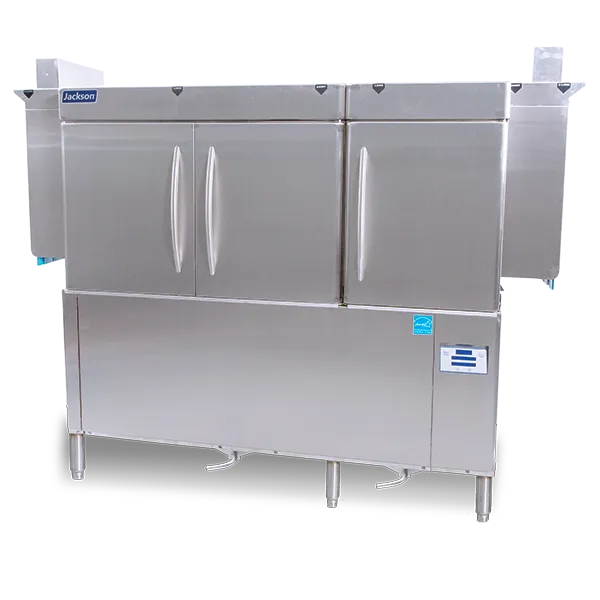 Elevate efficiency with cutting-edge solutions using the Jackson WWS, RACKSTAR 66CE Dishwasher, Conveyor Type. This high-performance dishwasher is designed to meet the demands of commercial restaurants, offering a single tank design with a capacity of approximately 223 racks per hour. With a fully automatic operation, including auto-fill and digital temperature readout, this dishwasher ensures consistent and efficient cleaning results. The double-wall insulated doors on the front provide energy efficiency, while the EnergyGuard controls allow for precise temperature control. The Dual Rainbow Rinse feature offers a choice between Econo (0.35 gpr) or Turbo (0.51 gpr) rinse options. Constructed with stainless steel, this dishwasher is durable and easy to clean. The adjustable bullet feet ensure stability, while the 3 HP pump and 1/4 HP conveyor guarantee powerful and reliable performance. NSF, cETLus, and ENERGY STAR certified, the Jackson WWS, RACKSTAR 66CE Dishwasher is the perfect addition to any commercial restaurant, delivering exceptional cleaning results while saving time and energy.