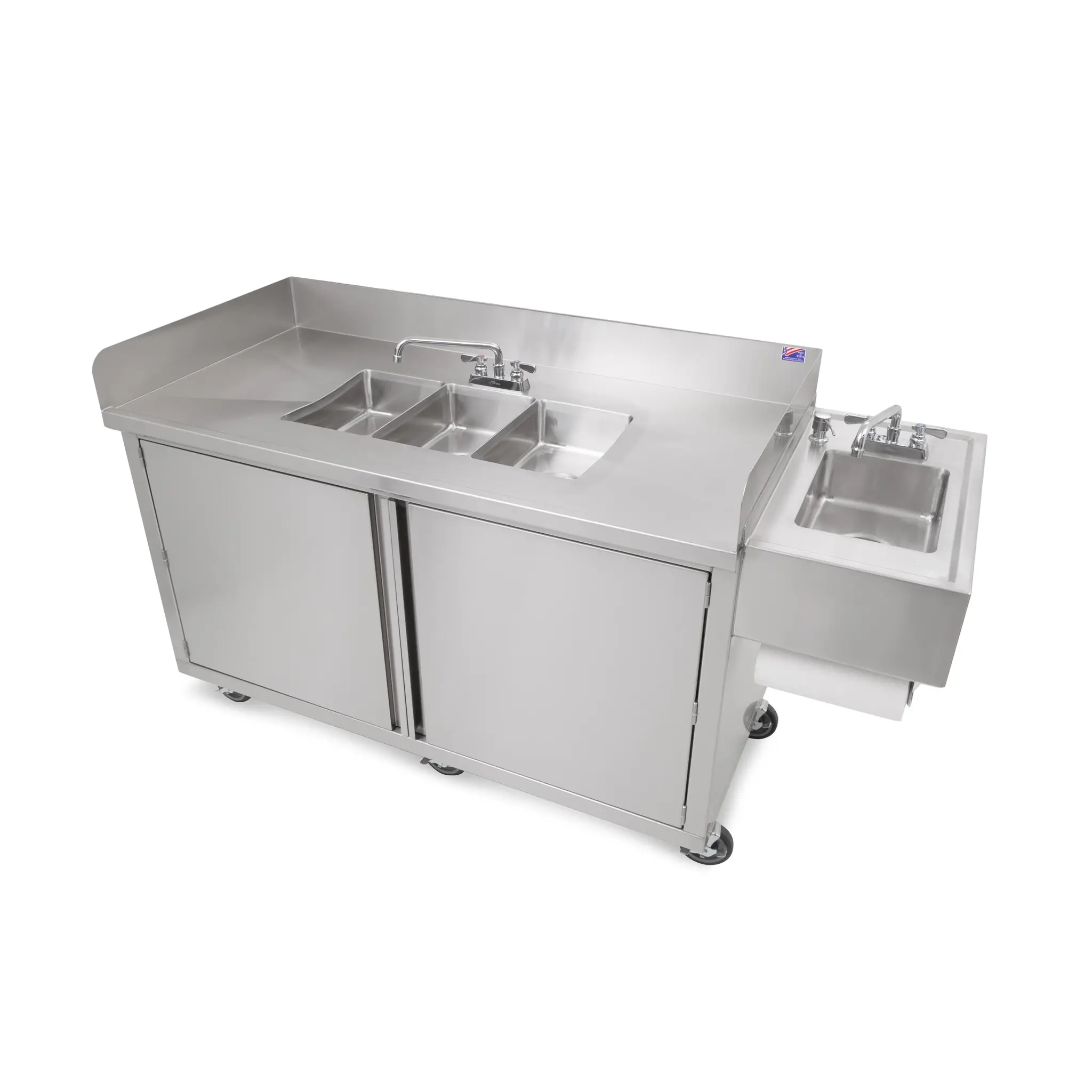 Modernize your service with smart tools through the John Boos MCS3-1014-HS Mobile Hand Sink. Designed specifically for commercial restaurant use, this self-contained sink is a game-changer for any food establishment. With its 3-compartment design and 5-inch deep compartments, you'll have plenty of space to wash, rinse, and sanitize dishes efficiently. The 16-gauge stainless steel top ensures durability and easy cleaning, while the 2 hinged doors with magnetic catches provide convenient storage. Equipped with a 10-inch swing spout faucet, soap and towel dispenser, and a 5-inch deep hand sink with a marine edge, this mobile hand sink has everything you need for a hygienic and efficient workflow. The 12-gallon water heater, city water connections, and optional fresh water and waste water tanks make it versatile for any location. Move it around effortlessly with the 5 locking casters. Upgrade your restaurant's efficiency and cleanliness with the John Boos MCS3-1014-HS Mobile Hand Sink.