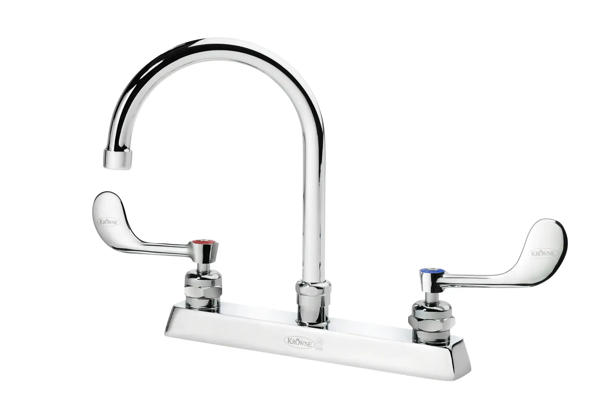 Maximize your food service potential with the Krowne Metal, 15-501L-W-E4 Gooseneck Faucet. This high-quality faucet is designed specifically for commercial restaurant use, ensuring durability and reliability in even the busiest kitchens. The Royal Series 8" Deck Mount Faucet features a 6" wide gooseneck spout, allowing for easy filling of large pots and pans. The VR wristblade handles provide precise control over water flow and temperature, ensuring efficient and accurate operation. With a 1.5 GPM aerator, this faucet helps conserve water without sacrificing performance. Whether you're running a bustling restaurant or a busy catering service, this faucet is a must-have for any commercial kitchen. Upgrade your kitchen with the Krowne Metal Gooseneck Faucet and experience the difference in performance and reliability.