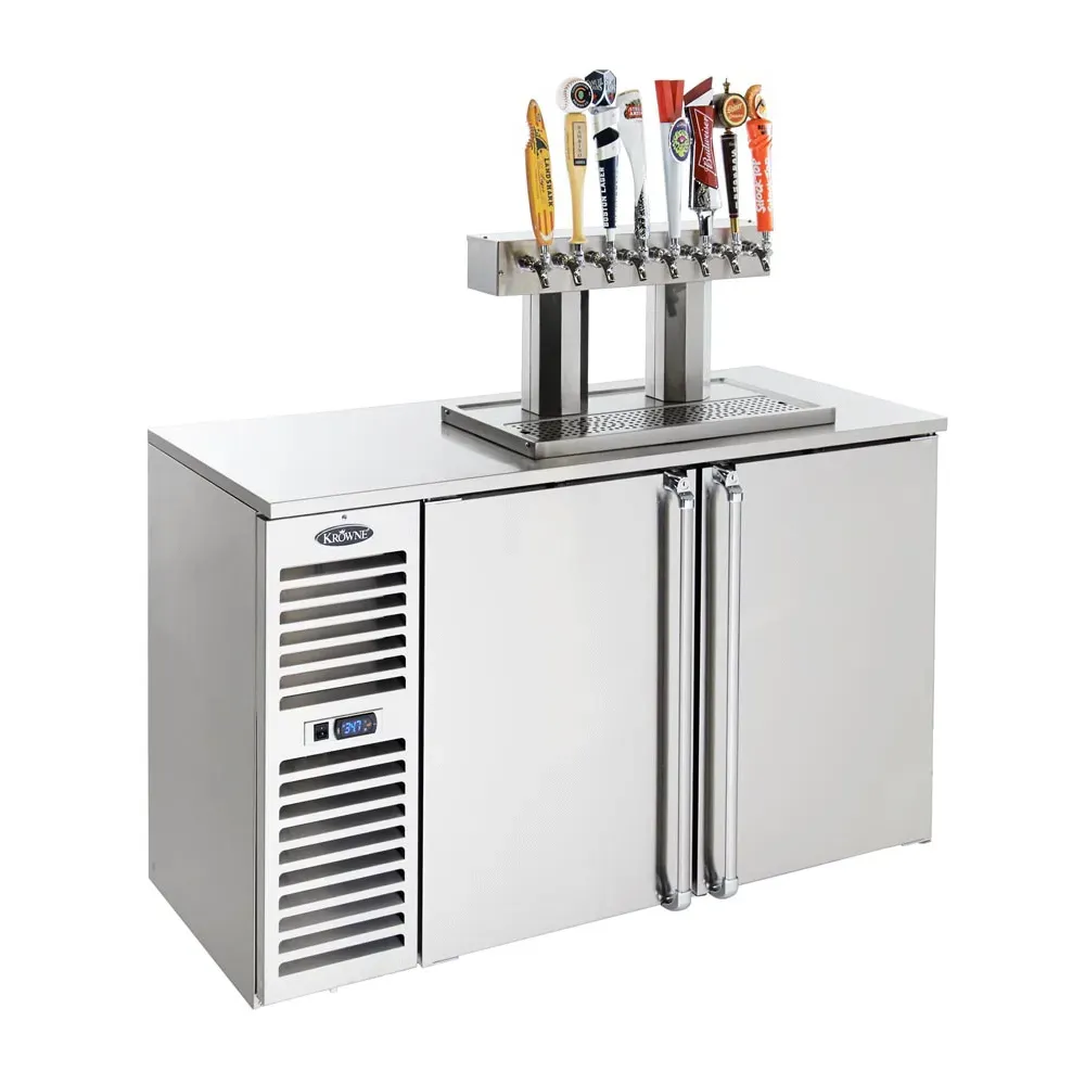 Create culinary magic with the Krowne Metal DB60L-BSS-RL Draft Beer Cooler. This self-contained two-door cooler is a must-have for any commercial restaurant looking to serve draft beer in style. With its 60" width and 24" depth, this cooler provides ample space for storing and chilling your favorite brews. The side-mounted self-contained refrigeration ensures optimal temperature control, keeping your beer at the perfect 30F to 40F range. The stainless steel draft beer tower features two faucets and a convenient 16" x 8" drain pan, making it easy to pour and clean up after a busy night. The two hinged doors come with locks for added security, while the stainless steel floor racks provide sturdy storage for your kegs. With its digital thermostat and condensate evaporator, this cooler is both efficient and reliable. Trust Krowne Metal to deliver a high-quality draft beer cooler that will elevate your restaurant's beverage service.