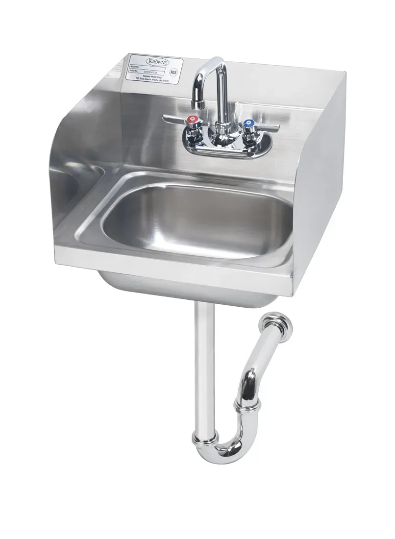 Master your restaurant's kitchen with the Krowne Metal HS-5 Hand Sink. This 16" wide hand sink is designed specifically for commercial restaurant use, making it an essential addition to any professional kitchen. With side splashes and a P-Trap with overflow, this hand sink ensures a clean and sanitary environment for your staff. Its compact size allows for easy installation in any kitchen layout, while its durable construction ensures long-lasting performance. Whether you're running a bustling restaurant or a small cafe, the Krowne Metal HS-5 Hand Sink is a must-have for maintaining cleanliness and hygiene in your kitchen.