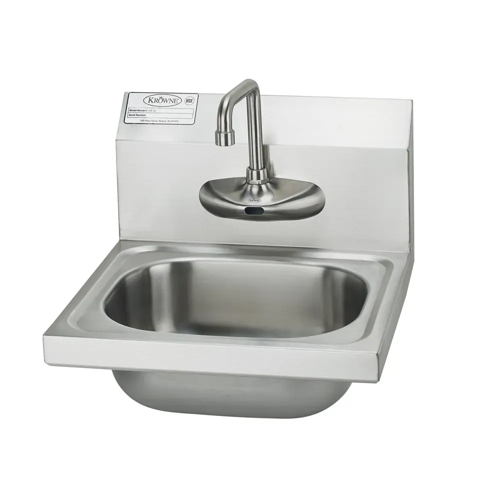 Equip your commercial kitchen with the Krowne Metal HS-67 Hand Sink. This 16" wide wall mount hand sink is designed to meet the needs of busy restaurant environments. With its satin 4" OC electronic faucet and 4-1/2" double bend spout, this hand sink offers convenience and functionality. The electronic faucet allows for easy hands-free operation, promoting hygiene and reducing the risk of cross-contamination. The double bend spout provides ample space for washing and rinsing utensils and dishes. Made by Krowne Metal, a trusted name in the industry, this hand sink is built to last and withstand the demands of a commercial kitchen. Whether you're running a restaurant, cafe, or catering service, the Krowne Metal HS-67 Hand Sink is an essential addition to your workspace.