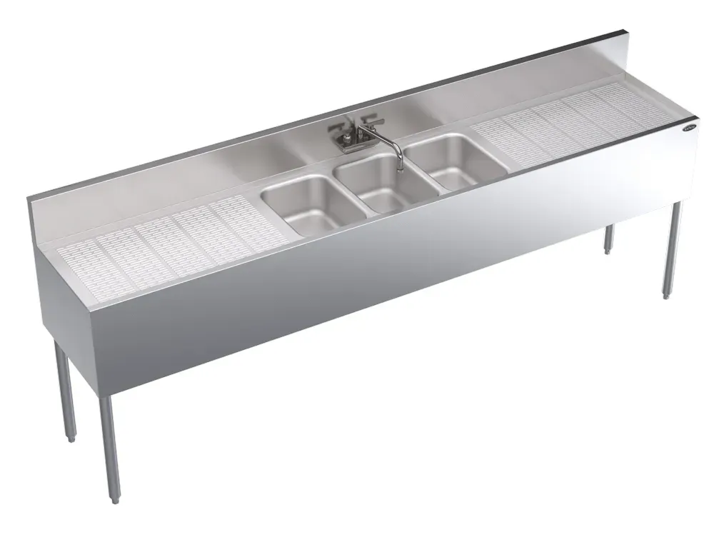 Cook with precision using the Krowne Metal KR19-83C Bar Sink. This Royal Series 96" Three-Compartment Bar Sink is designed to meet the demands of a busy commercial restaurant. With two 30" drainboards on the left and right, this sink provides ample space for food preparation and dishwashing. The 3-bowl design allows for efficient multitasking, ensuring that your kitchen operates smoothly. Made by Krowne Metal, a trusted name in the industry, this bar sink is built to last. It is packed with features that make it perfect for a commercial restaurant setting. The sink is 96" wide and 19" deep, providing plenty of room for washing large pots and pans. It is also easy to clean and maintain, saving you time and effort. Upgrade your kitchen with the Krowne Metal KR19-83C Bar Sink and experience the convenience and durability it offers.